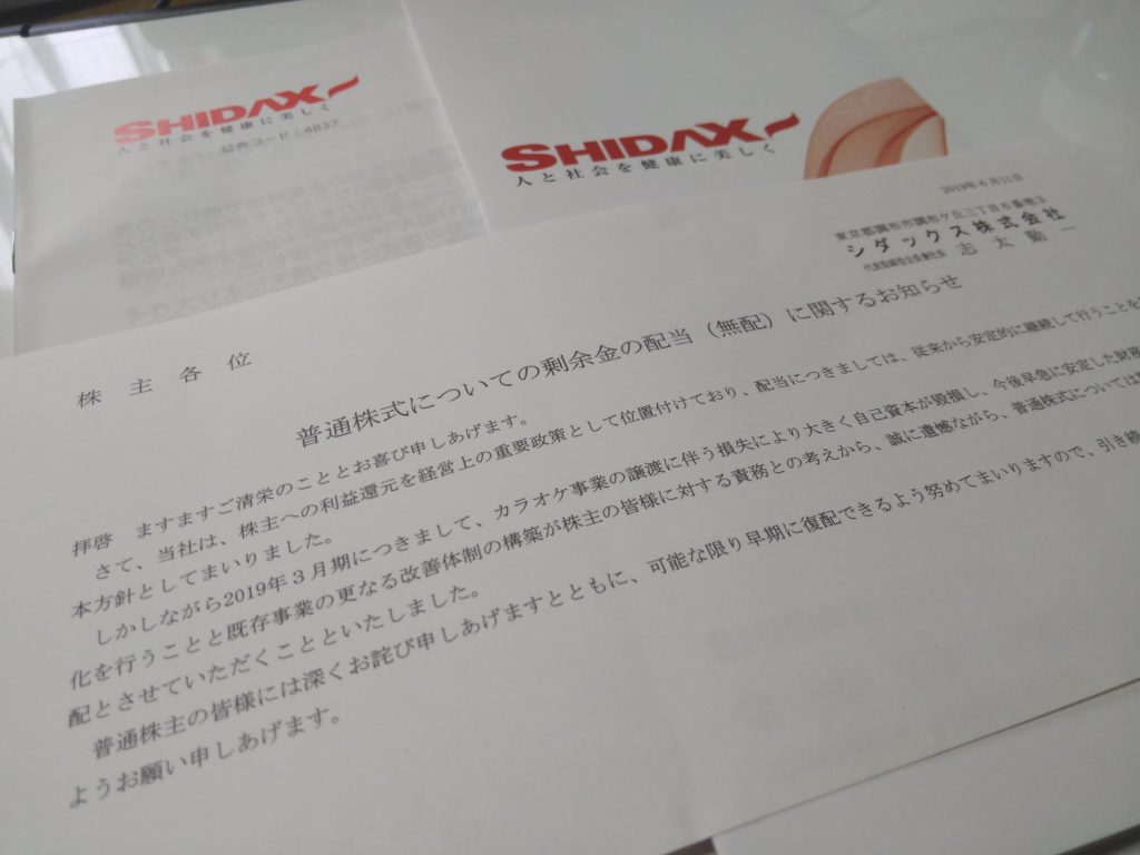 株主総会のシーズンで、配当金が入金されるシーズンでもあります。 今日は、シダックス株式会社の案内が届きましたが、いよいよ 「期末配当は無配とさせて頂きます」 という記載が。 最近業績良くないらしいですからね~。 株価も下がってますしね。 私が... -